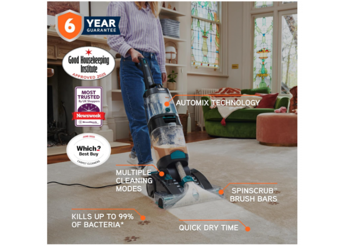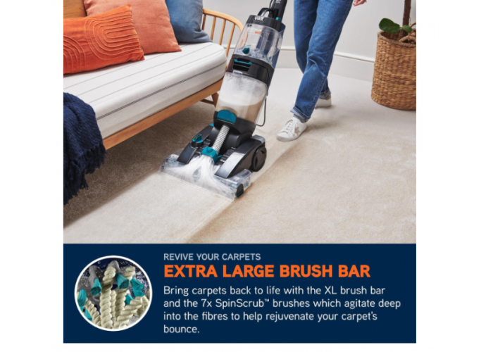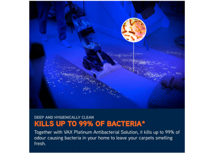 МОЩНАЯ ГЛУБОКАЯ ОЧИСТКА ДЛЯ ВОЗРОЖДЕНИЯ ВАШИХ КОВРОВ - Щетка XL и 7 вращающихся щеток SpinScrub глубоко проникают в волокна ковра, борясь с въевшимися пятнами, грязью и шерстью домашних животных, восстанавливая чистоту ковров. Она очищает ковры в 5 раз эффективнее, чем высокопроизводительный пылесос с резервуаром для чистой воды объемом 3,5 л и резервуаром для грязной воды объемом 2,9 л, а также уничтожает до 99% бактерий, вызывающих неприятный запах, благодаря антибактериальному раствору VAX Platinum, оставляя ковры чистыми и свежими на вид.