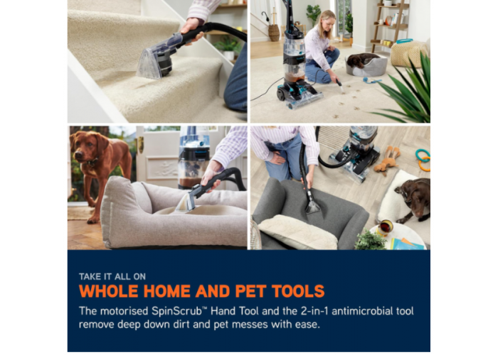 УНИВЕРСАЛЬНЫЕ НАСАДКИ ДЛЯ ЧИСТКИ ПЯТЕН И ОБИВКИ С АНТИМИКРОБНОЙ ОБРАБОТКОЙ - С помощью моторизованной ручной насадки SpinScrub, шланга длиной 2,5 м и антимикробной щетки 2-в-1 вы можете эффективно очищать стойкие пятна в вашем доме, включая лестницы, обивку мебели или салоны автомобилей, а антимикробная обработка защищает от роста бактерий, а скребок для твердых полов позволяет использовать пылесос для уборки пролитой жидкости на твердых поверхностях.