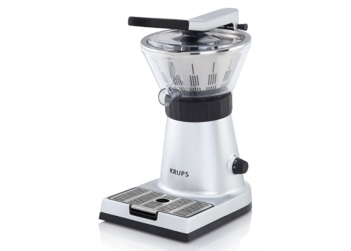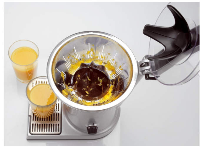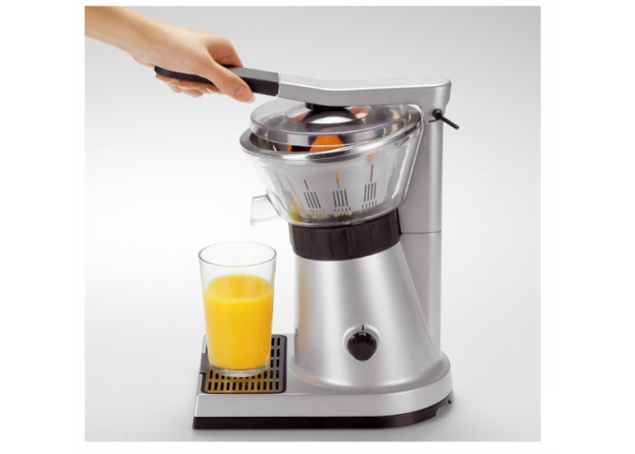 Электрическая соковыжималка экспресс-класса из литого алюминия с прямой подачей сока через стеклянную емкость.