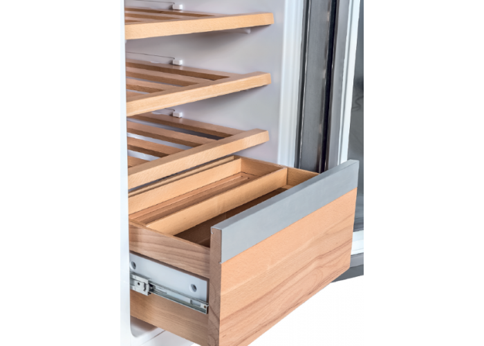 На полках можно разместить до 25 бутылок при оптимальной температуре от +5 до +16 градусов. Также имеется удобный ящик для других напитков.